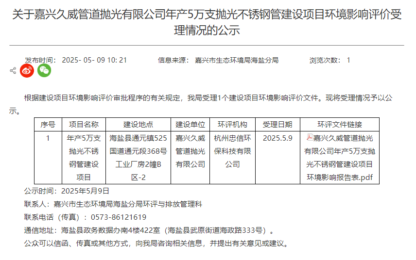 2025年5月9日, 嘉興市生態(tài)環(huán)境局海鹽分局受理嘉興久威管道拋光有限公司年產(chǎn)5萬支拋光不銹鋼管建設(shè)項(xiàng)目環(huán)境影響評(píng)價(jià)文件并對(duì)外進(jìn)行公示。